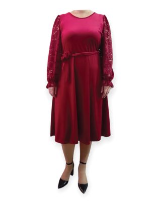 Γυναικείο φόρεμα midi Βελούδινο με πολύ απαλή υφή. Τα μανίκια είναι από ελαστική δαντέλα και διαθέτη αποσπώμενη ζωνούλα.