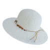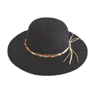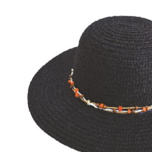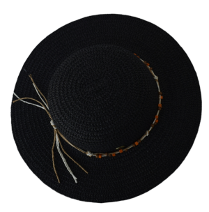 Γυναικείο καπέλο ψάθινο μαύρο με χάντρες Μ1582. Η εικόνα του ενισχύεται με λουράκια διακοσμημένα με μπεζ και καφέ χάντρες στο γείσο