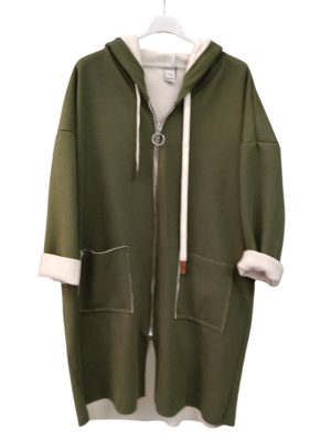 Έχει κουκούλα, ασημί φερμουάρ και εξωτερικές τσέπες.