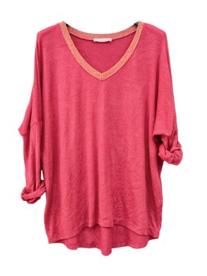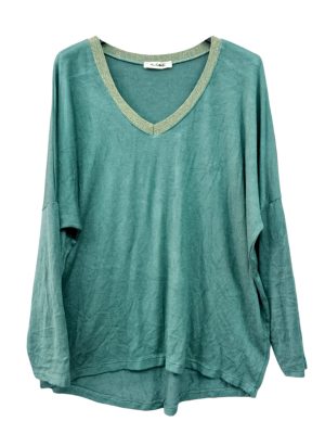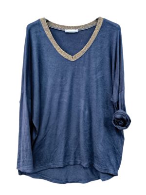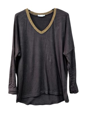 Πολύ λεπτό και απαλό ύφασμα με διακριτική χρυσή φάσα στο λαιμό και οριζόντια ραφή στα μανίκια που τα καθιστούν πιο στενά απο τον αγκώνα και κάτω.